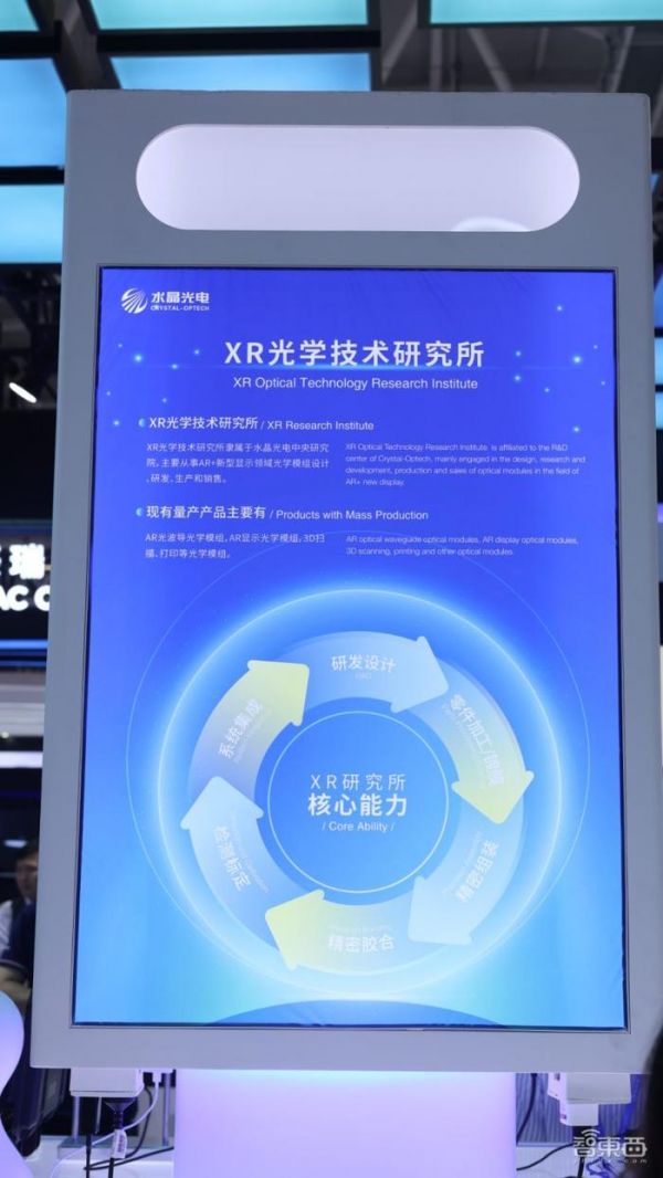 像是欧菲光、水晶光电、三安光电这些老牌光电公司,都在此次展会上展出相应的展品。但相较而言,水晶光电这次将VR/AR作为了展示的重点,通过多款体全息波导片,展示其最新在该领域的布局。而欧菲光则在智能车载、手机领域展示多款光学模组,VR/AR领域的光学模组仅简单展示了几款,并非其重点。