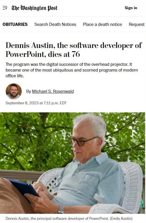 IT之家 9 月 9 日消息,据《华盛顿邮报》当地时间 9 月 8 日报道,PowerPoint 的发明者之一 —— 丹尼斯・奥斯汀(Dennis Austin)于今年 9 月 1 日在美国加利福尼亚州洛斯阿尔托斯(Los Altos)的家中去世,享年 76 岁。