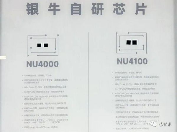 △银牛自研芯片据银牛介绍,NU4000芯片将双目立体视觉技术的算法芯片化,该芯片不仅包含全球领先的3D感知处理硬件单元,还集成了AI与SLAM硬件引擎,有效分担系统算力、降低系统功耗和成本。2022年成功量产的NU4100芯片相较前者则在深度感知及SLAM引擎保持不变,但是集成了2路4K的ISP(图像处理模块)并对片上AI引擎进行了迭代升级,AI算力相比NU4000几乎翻倍,以更低成本、更低功耗的方式帮助客户实现系统升级。两项关键性技术点的提升,使得NU4100在越来越多的彩色图像与3D视觉结合的场景中 (如无人机、3D扫描、割草机等),处理起来更加得心应手。