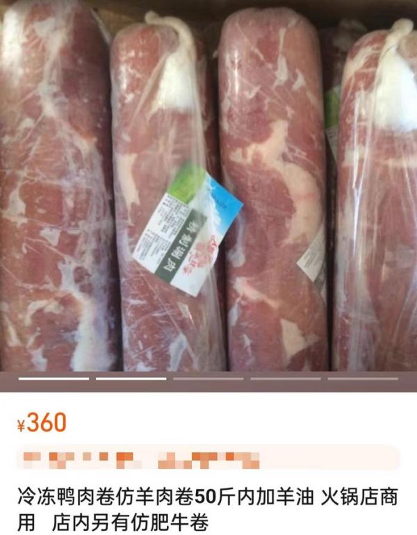 “口感和外观肯定会有一些区别。”一家售卖“混合肉”的商家向中新财经表示,其混合肉为鸭肉和牛羊脂肪混合制作。“牛肉卷里面瘦肉是鸭肉,肥肉是牛脂肪,吃起来有牛肉味,但不会一模一样。”