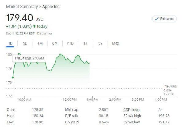 9月8日周五美股午盘时,苹果涨1%,脱离两周新低并止步两日连跌,此前两日共跌去6.4%。