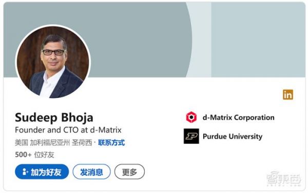 ▲Sheth领英页面截图据领英显示,d-Matrix目前有大约100名员工,公司致力于构建一种使用存内计算(In-Memory Computing,IMC)技术和芯片级横向扩展互连进行数据中心AI推理的新方法。据称,该处理器将提供比CPU和GPU更快的AI推理性能,适用于大型Transformer模型。