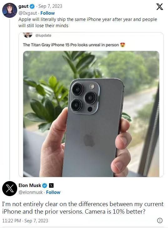 一位X用户发帖称:“苹果会年复一年地推出同样的iPhone,而人们仍然会失去理智。”马斯克回应称:“我不太清楚我现在的iPhone和之前的版本有什么不同。相机好了10%?”