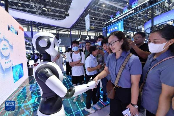 新华全媒+丨数博会上感受智能机器人科技魅力---9月7日,参观者在数博会上与人形机器人握手。