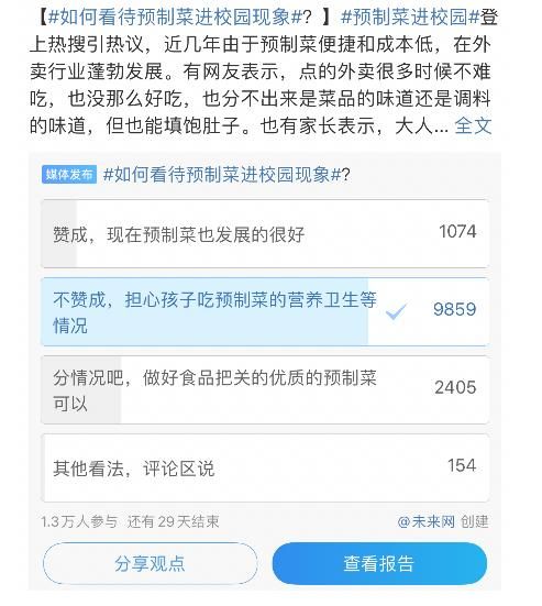 今日,多家媒体发布了一则“如何看待预制菜进校园现象”的投票,相关话题中,有超过80%的网民选择了“不赞成,担心孩子吃预制菜的营养卫生等情况”,仅有不到10%的网民认同预制菜走进校园。