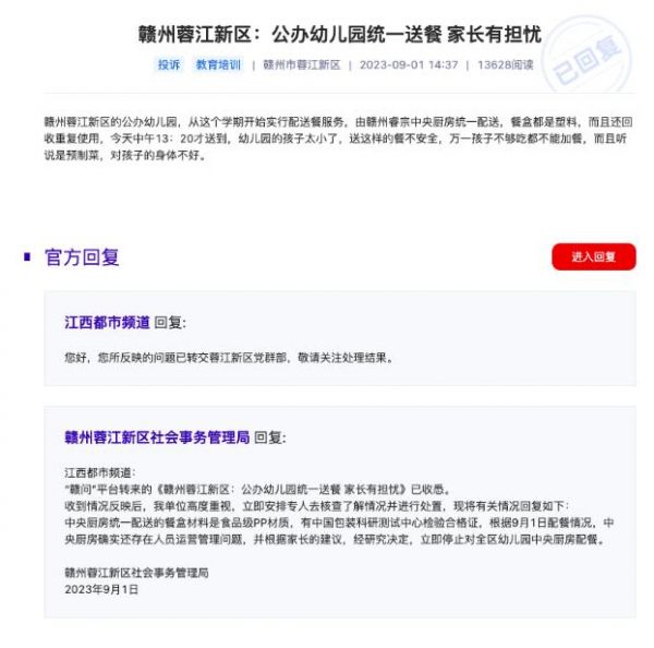 当日,赣州蓉江新区社会事务管理局对该投诉进行了回复,称:“中央厨房统一配送的餐盒材料是食品级PP材质,有中国包装科研测试中心检验合格证,根据9月1日配餐情况,中央厨房确实还存在人员运营管理问题,并根据家长的建议,经研究决定,立即停止对全区幼儿园中央厨房配餐。”