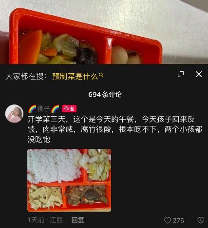 与此同时,短视频平台上有不少家长开始反馈,自己孩子吃的是预制菜。