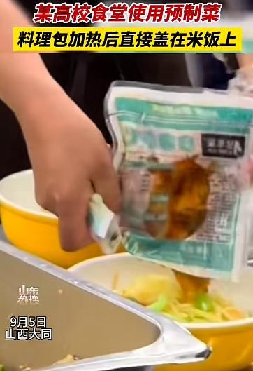 除了幼儿园、小学、中学外,一些大学食堂里也会出现使用预制菜的情况。不止一位大学生向蓝鲸财经记者透露,自己所在大学的食堂窗口使用预制菜,工作人员将料理包加热后直接盖在米饭上,口感、味道一言难尽。