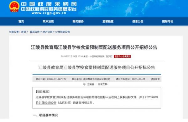 此外,记者还发现,中国政府采购网曾于今年7月发布了一则“江陵县教育局江陵县学校食堂预制菜配送服务项目公开招标公告”,公告显示,预算金额3000万元,采购江陵县学校食堂预制菜配送服务。
