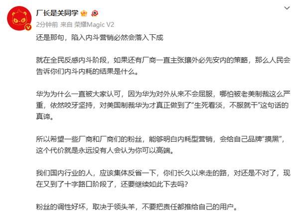 该博主表示:就在全民反感内斗阶段,如果还有厂商一直主张攘外必先安内的策略,那么人民会告诉你们内斗内耗的结果是什么。华为为什么一直被大家认可,因为华为对外从来不会屈服,哪怕被老美制裁这么严重,依然咬牙坚持,对美国制裁华为才真正做到了“生死看淡,不服就干”这句话的真谛。一些厂商和厂商们的粉丝应该明白内耗型营销,会给自己品牌“摸黑”,这个代价就是永远没有人会认为你可以高端。