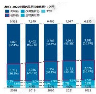 中国的用药格局中创新药所占比例一直很低,2017年以前,甚至曾低至9%左右。到2022年,这个比例已经有所提高,但是仍然只有30%左右。据医药行业第三方咨询机构“医药魔方”数据为30.4%。但是,这相比发达国家创新药费用占比达到68%的水平,仍然有较大差距。
