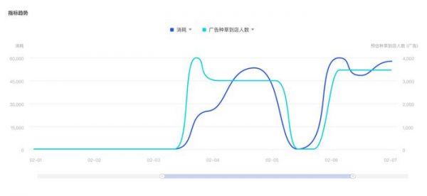 商家还可以自选2个指标,比如广告投放的消耗额与广告带动的门店种草客流,来对比它们在一段周期内的趋势变化。
