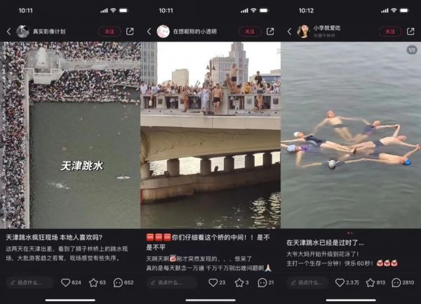虽说大爷跳水盛景不再,但不妨碍我们复盘这一民间自发城市景观的走红链条: