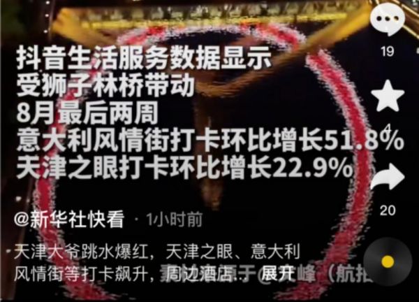 但天津并不像北京、河北省有诸多古迹可供游览,慕名而来的游客吃过早饭就无事可做,于是遵从天津人“这城市就适合四处溜达”的建议四处闲逛。在这过程中,他们从游客成为了天津的“新景点发掘者”。硬糖君发现,5、6月,网上出现了“天津之眼有孙悟空”的旅游攻略,发布者基本都是来天津的游客。几乎同一时间,天津动物园也因为“没有动物吃挂面”的天津话版游客提醒,小小的火了一把。这些“新景点”有一定话题性,但没有太强的可参与性。直到7月底8月初出现“大爷跳水”,才真正将天津推上热搜。故事的主角狮子林桥地理位置得天独厚。它位于河北区意式风情区附近,是连接天津市和平区与河北区的桥梁,也是游客集散重地。天津人已经熟视无睹的老头儿跳水,对游客来说不仅是奇观,也是社交话题。游客从意风区参观结束准备去海河边走走,一抬头看见大爷跳水,怎能不驻足猛拍顺便发个朋友圈?