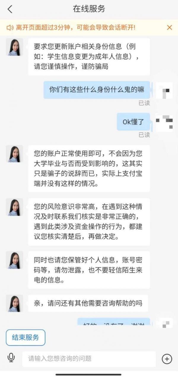 其实这个骗子口中所谓的“学生信息”都是他们诈骗的话术,后来我特就此咨询过支付宝客服,回复如上图。希望大家也提高警惕,谨防骗局。