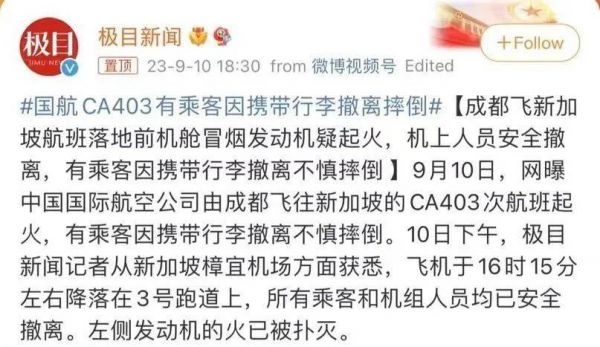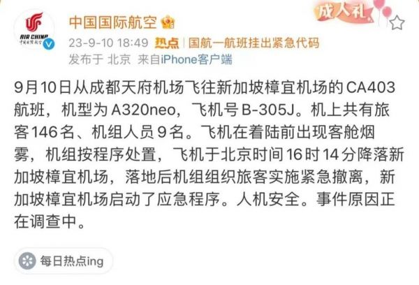 9月10日下午,从成都天府机场飞往新加坡樟宜机场的国航CA403航班,飞机在着陆前出现客舱烟雾: