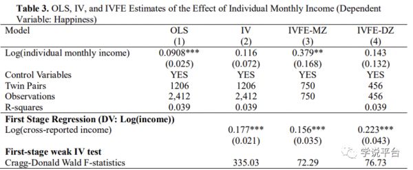 第2列“使用交叉报告收入作为工具变量的IV估计”:为了纠正报告收入中可能存在的测量误差,本文使用双胞胎的交叉报告收入作为同一个双胞胎的自我报告收入的工具变量。交叉报告收入来自对问题“你的双胞胎兄弟姐妹去年的年收入是多少?”的答案,然后除以12。收入效应的IV估计值为0.116(p值为0.109,边缘显著),略大于第1列的OLS估计值,这表明OLS估计中可能存在一些衰减偏差。