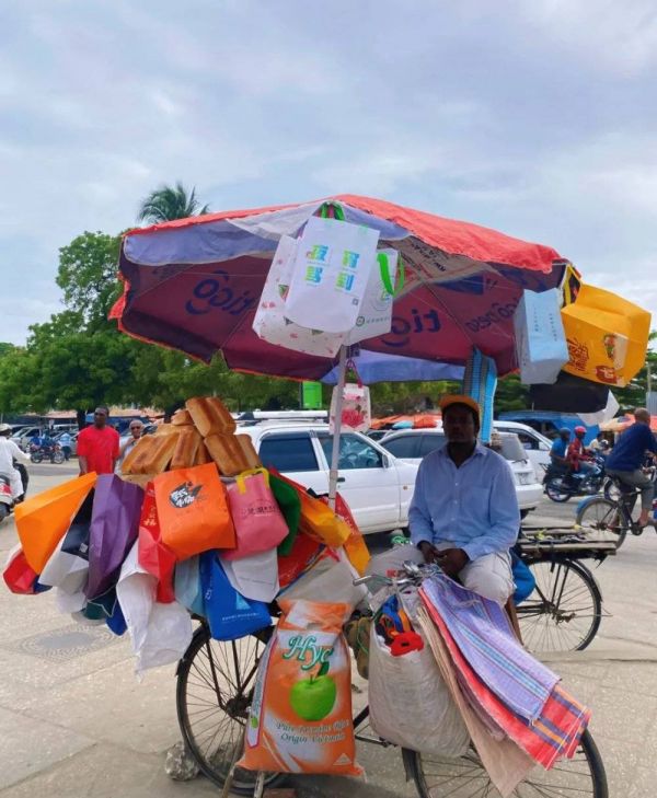 坦桑尼亚达累斯萨拉姆的菜市场,经常能碰到拎着一堆手提袋叫卖的人,没有他们,空手去菜市场买十颗土豆你都不好搬回家。
