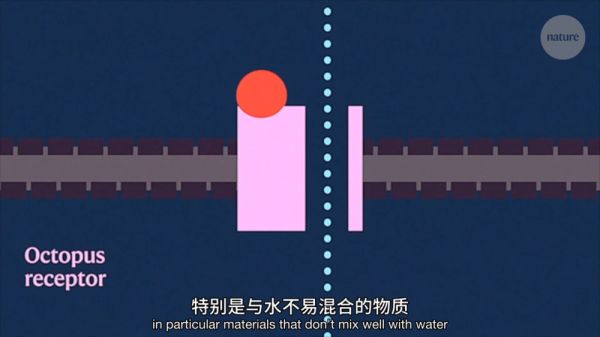 但章鱼的受体则不同,它不是笼状的,它们演化出一种浅沟,能与更多种类的物质结合,特别是与水不易混合的物质,如潜在猎物留在海底的各种油状残余,是个有用的狩猎工具。