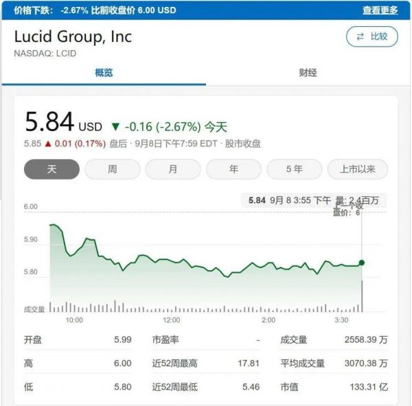 截至9月8日收盘,Lucid股价下跌2.67%至5.84美元。