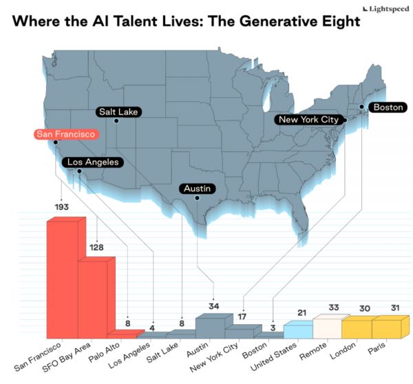 受此影响,旧金山的海耶斯社区,已被重新命名为“脑谷”,以反映其作为AI活动、聚会和黑客之家所在地的地位。与此同时,人才似乎正在涌回规模较大的城市和湾区(或者至少更多AI人才开始在AI公司寻找新工作)。
