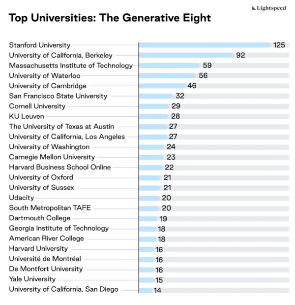 此外,统计发现,生成式AI八巨头的科技人才中,教育背景在很大程度上都来自于全球知名高校,其中斯坦福大学、加州伯克利大学和麻省理工包揽了前三名;与此同时,他们的来源也很国际化,加拿大滑铁卢大学AI研究所排名第四,比利时鲁汶大学AI研究所排名第八。