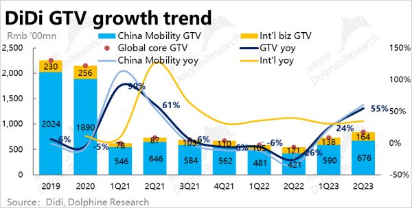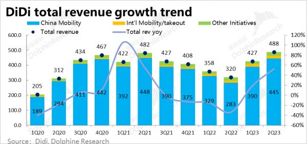 整体业绩上,滴滴二季度实现总营收488.5亿,同比大增52.6%,但主要系去年特殊环境下基数极低。若对比2021年同期(当时既无疫情、滴滴也未受监管影响),总营收增长不到1%。乐观者来看,滴滴已完全渡过了“疫情和监管下”的低谷;而悲观者来言,则是滴滴虚度两年、规模增长近乎为零。