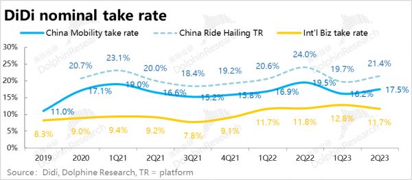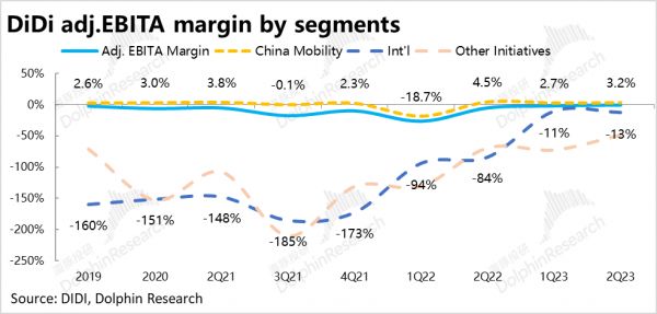 a. 核心的国内出行业务,因规模效应环比提升,EBITA 环比增加了约4亿。但利润率为3.2%,无论相比2022年同期(当时有 3% 的 VAT 减免利好),还是2021年同期都是在下降的。即随着滴滴在国内竞争地位的恶化,其盈利空间的恶化也在所难免。