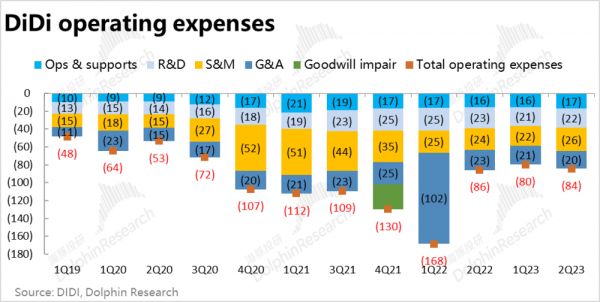 由上文可见,滴滴核心的国内业务利润率实际相比2021年和2022年都是下降的,却仍能实现不断减亏,从业务的角度来看主要是由于海外和创新业务的减亏。而从“收入-费用”的角度可见滴滴本季度的总经营费用仅为84.3亿,甚至比2022年同期业务量大幅减少时支出的85.9亿更少。可见公司控费力度之大,唯有营销投入是同比提升的。