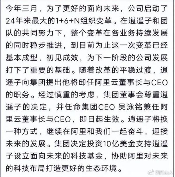 然而,在阿里云即将分拆上市的关键时刻,张勇却选择了挥手告别。据阿里巴巴集团主席蔡崇信在内部信中透露,张勇向集团提出了卸任阿里云的请求,并得到了董事会的尊重。集团CEO吴泳铭(花名东邪)接替张勇兼任阿里云董事长兼CEO。同时,阿里巴巴决定投资10亿美元支持张勇设立面向未来的科技基金,并授予他阿里史上第一个“功勋阿里人”荣誉称号。