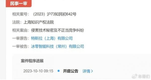 近日,特斯拉(上海)有限公司与冰零智能科技(常州)有限公司侵害技术秘密及不正当竞争纠纷案件新增开庭公告,原告为特斯拉(上海)有限公司,该案将于10月10日在上海知识产权法院开庭审理。