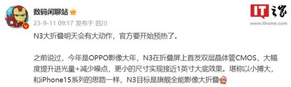 IT之家 9 月 11 日消息,OPPO 官方提前对旗下新机开启预热,宣布“明早九点,OPPO 将携手‘神秘伙伴’官宣重磅消息”。再结合今日早些时候 @数码闲聊站 的爆料 ——“N3 大折叠明天会有大动作”,二者基本可以对得上,也就是说 OPPO Find N3 折叠屏手机将在明早 9:00 正式亮相。