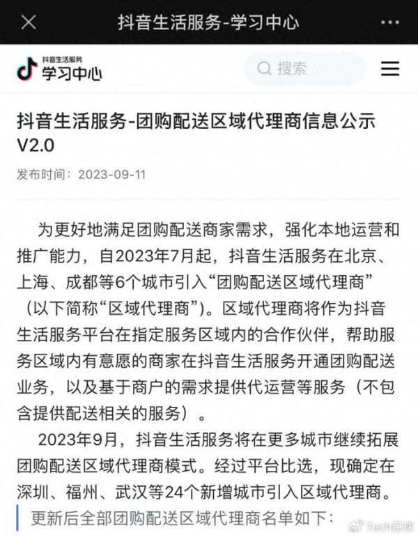 为更好地满足团购配送商家需求,强化本地运营和推广能力,自2023年7月起,抖音生活服务在北京、上海、成都等6个城市引入“团购配送区域代理商”(以下简称“区域代理商”)。区域代理商将作为抖音生活服务平台在指定服务区域内的合作伙伴,帮助服务区域内有意愿的商家在抖音生活服务开通团购配送业务,以及基于商户的需求提供代运营等服务(不包含提供配送相关的服务)。