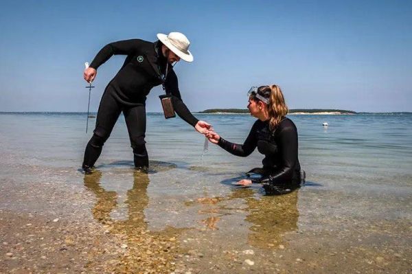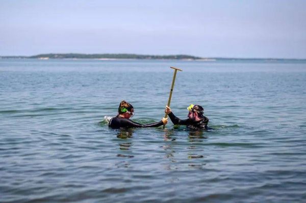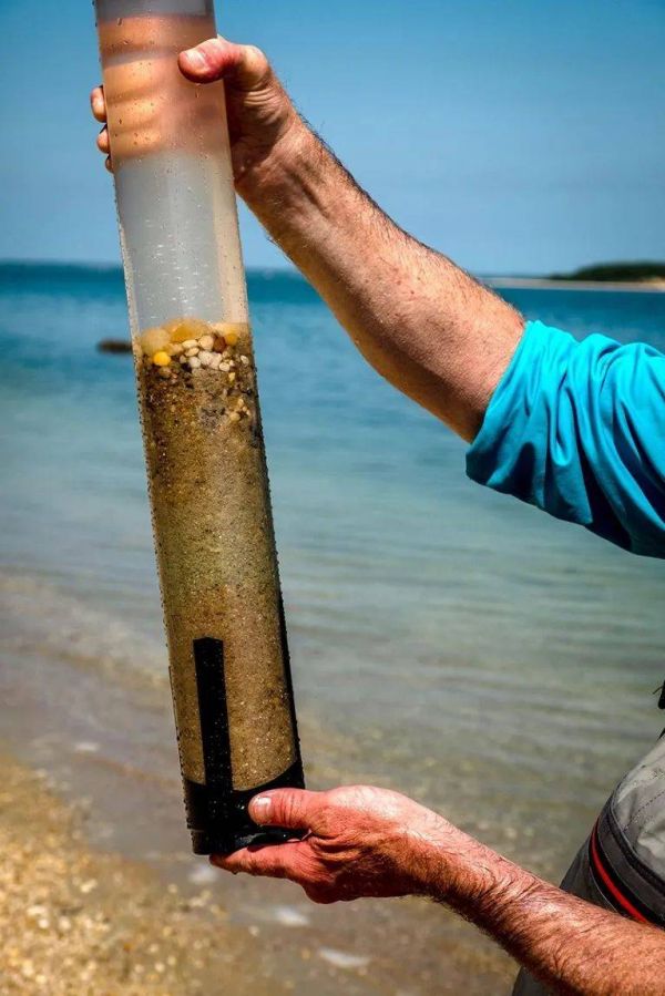 美国纽约北海海滩(North Sea Beach),实验团队正在采集海底沉积物的岩心样本。来源:Hilary Swift for Nature