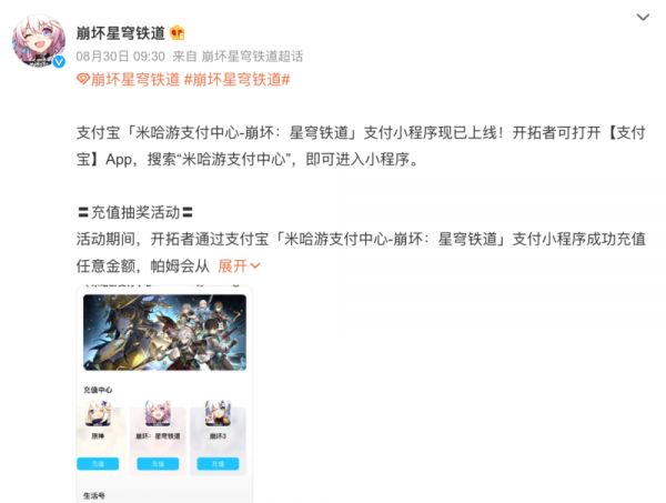 而这也进一步影响到米哈游做切支付这件事的决心。理论上来说,切实能撬动苹果奶酪的小程序充值,米哈游理应通过组合营销手段大力推广。但实际上直至下架,iOS小程序的充值也仅限官服,且充值优惠也与游戏内持平,微博抽奖等活动的力度也不大。
