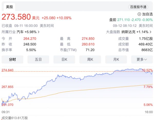 当地时间 9 月 11 日,特斯拉股价暴涨 10.09%,报收于 273.58 美元,市值 8683.41 亿美元,其市值一夜增加 799 亿美元(约合人民币 5800 亿元)。