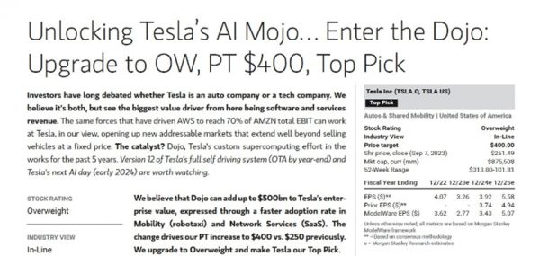 当地时间 9 月 11 日,摩根士丹利的报告预计在接下来的 12 个月内,特斯拉的目标股价将从 250 美元飙升至 400 美元,这意味着股价有望上涨 60%。