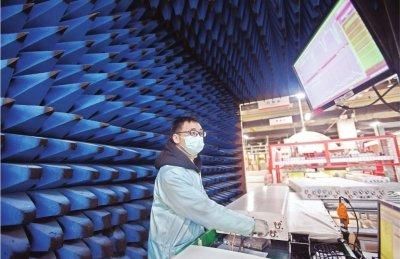 中信科移动工人对通讯产品进行出厂检测。