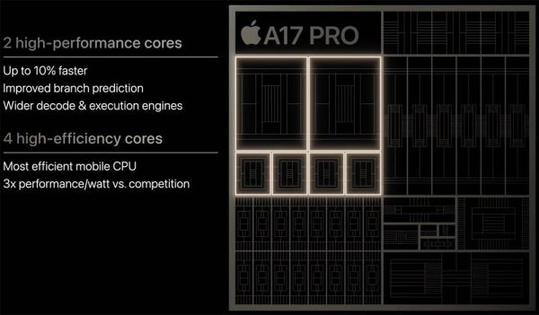 A17 Pro采用6核CPU,全新CPU微架构和设计改进同时适用于性能核心和能效核心。性能核心提升最快可达10%,单线程性能甚至堪比某些高性能桌面级PC;能效核心在业界一骑绝尘,带来竞品3倍的性能功耗比。