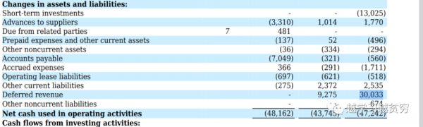但从万春2021年财报的利润表里找不到这3000万美元,反而是从现金流量表里找到了:deffered revenue(递延收入),在做账时计入负债端。