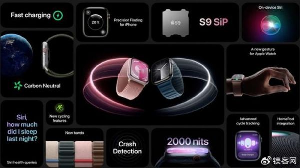 Apple Watch推出了全新一代的Series 9,外观部分与上代几乎没有变化,新增了配色与新表盘表带。屏幕部分有所提升,户外峰值亮度达到了2000nits,室外使用更方便。