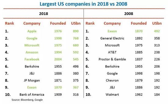 据美国媒体Milfordasset统计,2008年和2018年全球市值前十的企业发生了如下变动。