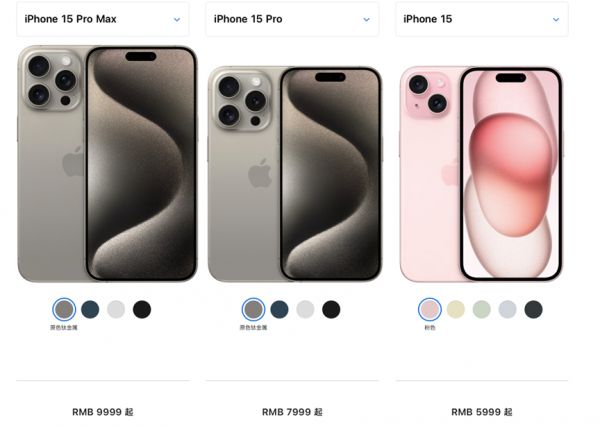 最后,回到大家最关心的价格问题上。苹果官网显示,iPhone 15起售价为5999元,iPhone 15 Plus起售价为6999元,iPhone 15 Pro和iPhone 15 Pro Max起售价分别为7999元和9999元。