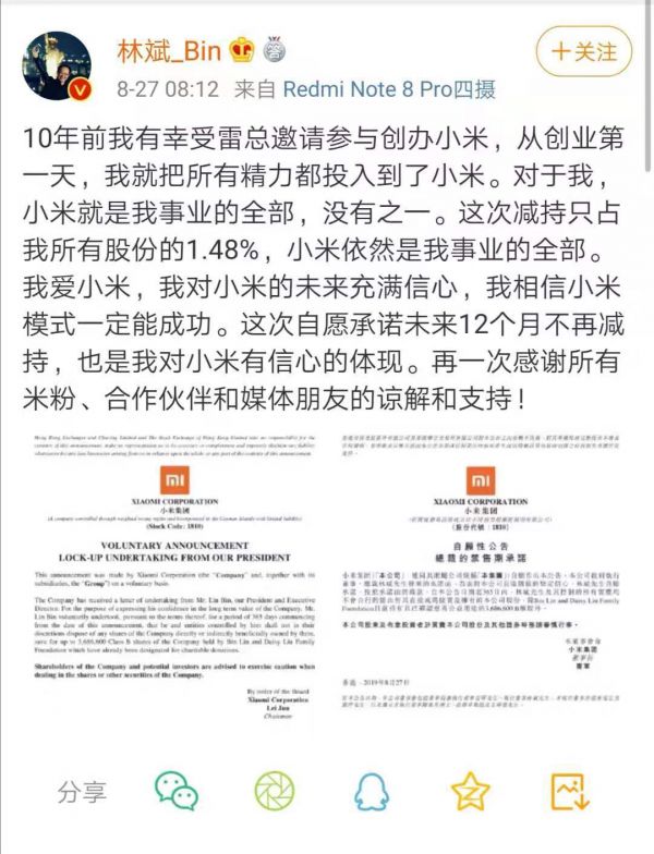 除此之外,林斌也发文表示小米是其事业的全部,没有之一。此次只占其所有股份的1.48%。这次自愿承诺未来12个月不再减持,也是其对小米有信心的体现。(静静)