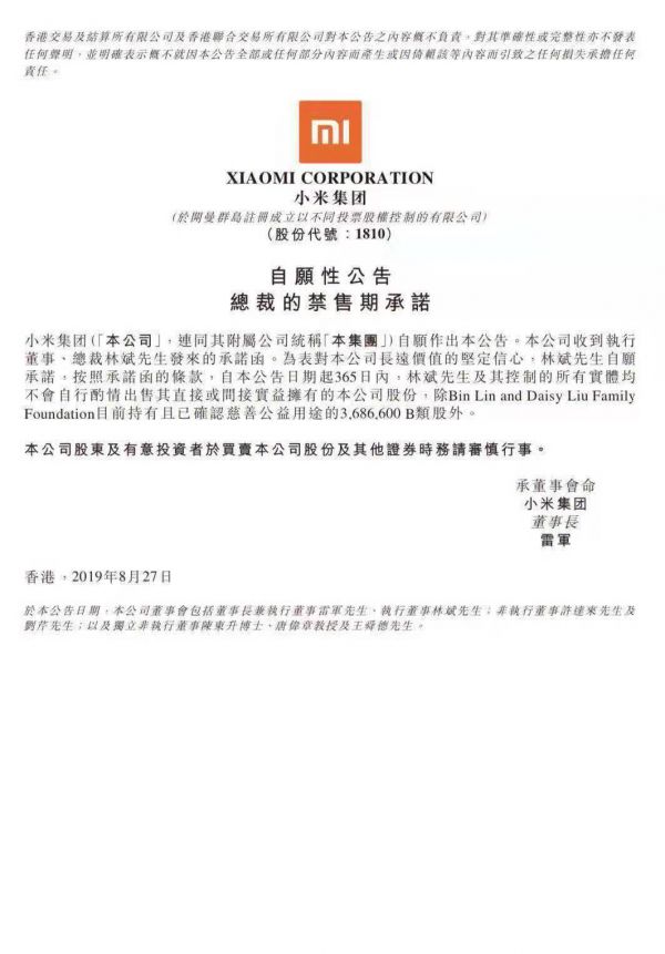 今天小米发布公告称,林斌自愿承诺,按照承诺函的条款,自公告日期起365日内,林斌及其控制的所有实体均不会自行酌情出售其直接或间接实益拥有的本公司股份。除Bin Lin和Daisy Liu Family基础目前持有且已确认慈善公益用途的3,686,600 B类股外。