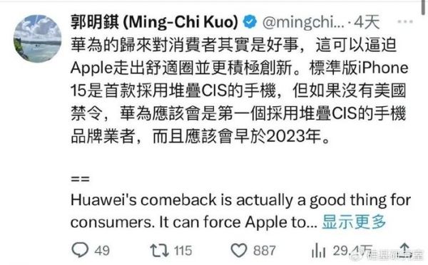 此前,天风证券分析师郭明錤就表示:“华为的到来对消费者其实是好事,这可以逼迫Apple走出舒适圈并更积极地创新。”