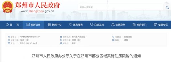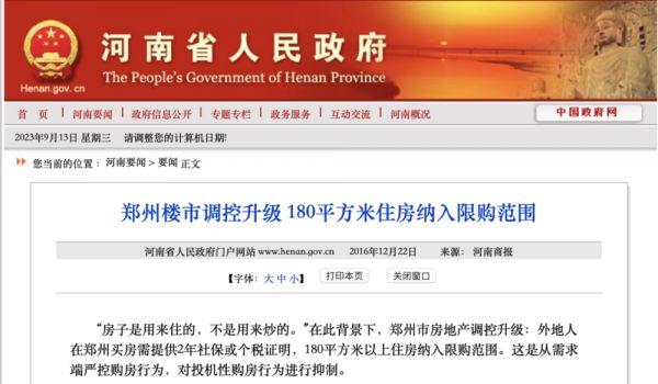 随后的2016年12月21日,郑州市人民政府在官方网站发布重大消息,12月22日起,郑州房地产市场调控升级,在原来的限购基础上,将180平方米(含)以上住房(包括新建商品住房和存量住房)也纳入限购范围。