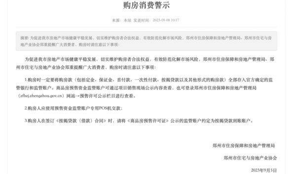 《每日经济新闻》记者留意到,9月5日,郑州市住房保障和房地产管理局、郑州市住宅与房地产业协会联合发布了一则购房消费警示,其中第一条便是:购房时一定要将购房款(包括定金、保证金、首付款、一次性付款、按揭贷款以及其他形式的购房款)全部存入官方确定的监管银行和监管账户。