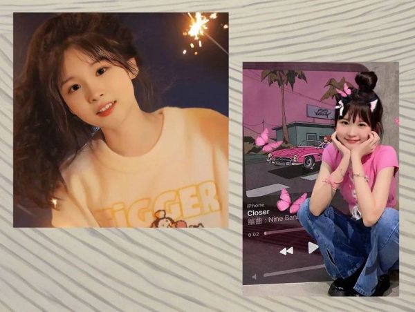 头像:大眼睛,尖下巴,丸子头,穿芭比粉色的T恤和牛仔裤,双手托腮,面对镜头甜美微笑。