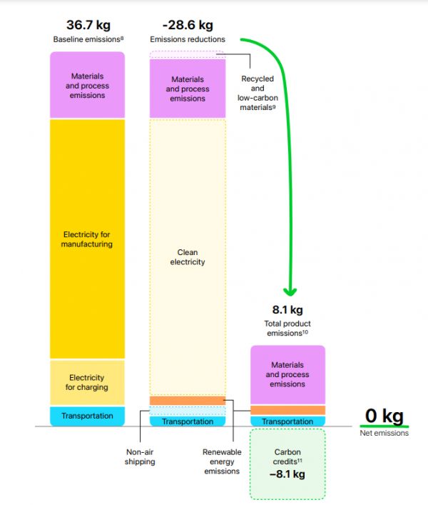 中间的柱子,表示苹果用绿电替代了生产耗电、使用耗电,也就打掉了绝大多数的排放。而苹果在材料和运输端,也使用了很多技术(也讲了很多故事),但是减碳的成效很小。最右的柱子,是剩余的碳排放。苹果种了些树,把剩余的这8.1kg碳抵消了。